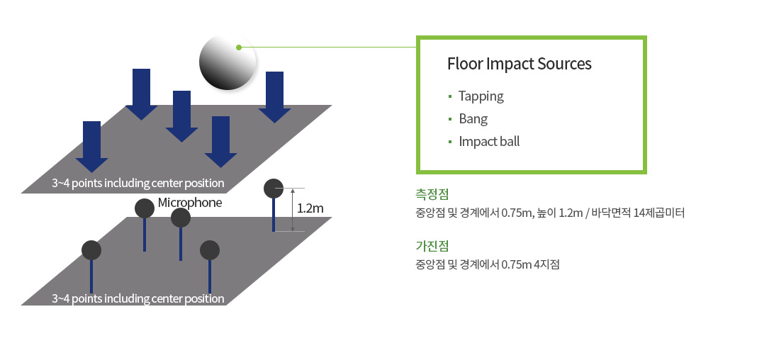 공동주택의 바닥구조체를 통하여 아래 층 세대로 전달되는 경량 및 중량충격음에 대한 바닥충격음 차단성능을 KOLAS(공인인증기관)에서 측정하여 분석 평가한다.